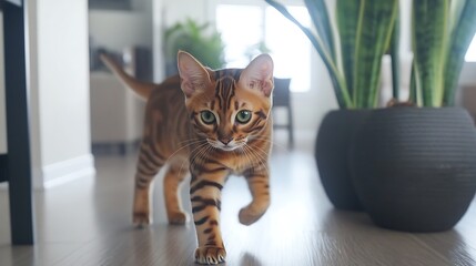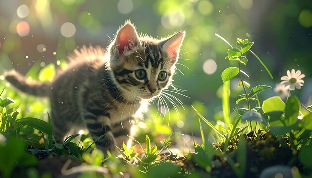 A cute, curious kitten explores a sun-dappled garden, surrounded by lush green foliage and delicate wildflowers, with bokeh