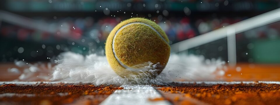 A Powerful Tennis Ball Bouncing on Court with Dust Plume and Gritty Sports Aesthetic