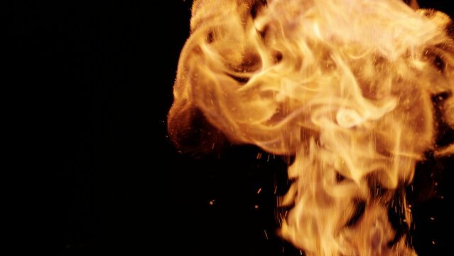Lightning bolt strikes fiery explosion amid dark stormy clouds