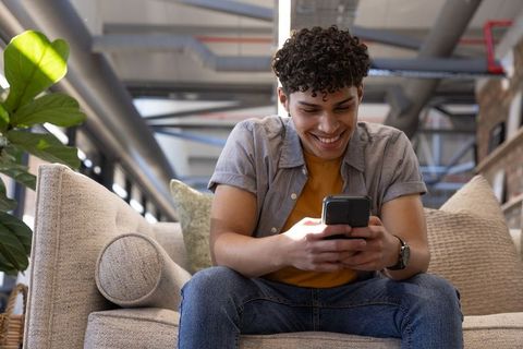 Smiling young man engaged with smartphone in modern lounge