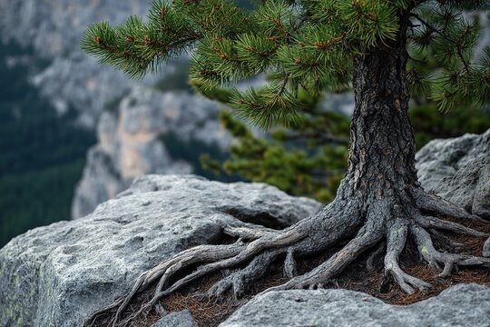 Majestic Tree with Exposed Roots: A large, healthy tree stands tall, its extensive root system fully visible, symbolizing strength, resilience, and the interconnectedness of nature.