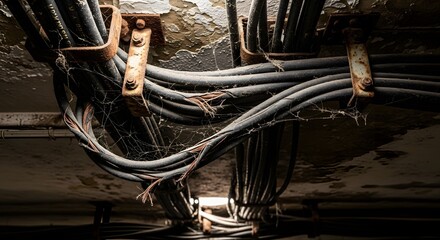 Electrical wiring details in corner of apartment with exposed wires and ceiling damage background showing installation challenges