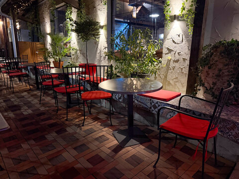 Outdoor cafe terrace with black chairs and red cushions surrounded by plants at night. Hospitality, leisure, and urban culture expressed through dining, decor, and social lifestyle.