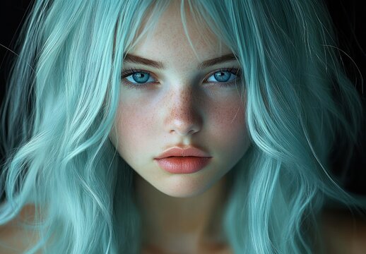 Close-up portrait of a young woman with striking blue eyes, light blue hair, and freckles, expressing calm intensity against a dark background
