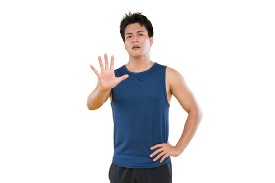 Stop Gesture: Man Showing Stop Sign with Hand, Expressing Denial and Warning in a Concept of Control and Forbidden Actions With A Smile