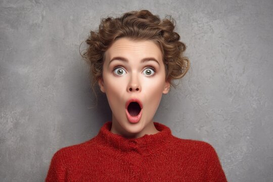 Woman expressing surprise and shock with open mouth and wide eyes in a neutral gray background
