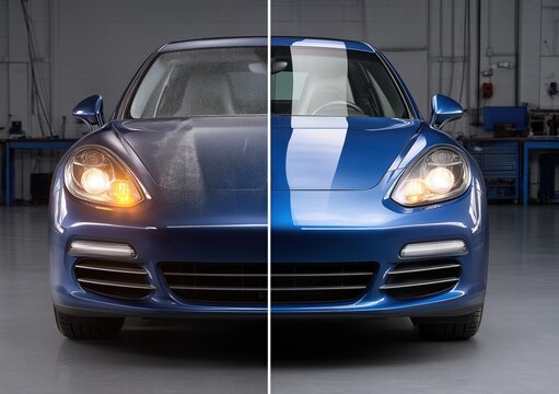 Blue car before and after polishing split view clean transformation. Concept of detailing, maintenance, and automotive restoration expressing satisfaction and contrast.