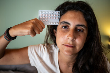 Contemplative young woman relaxing on living room couch with thoughtful expression