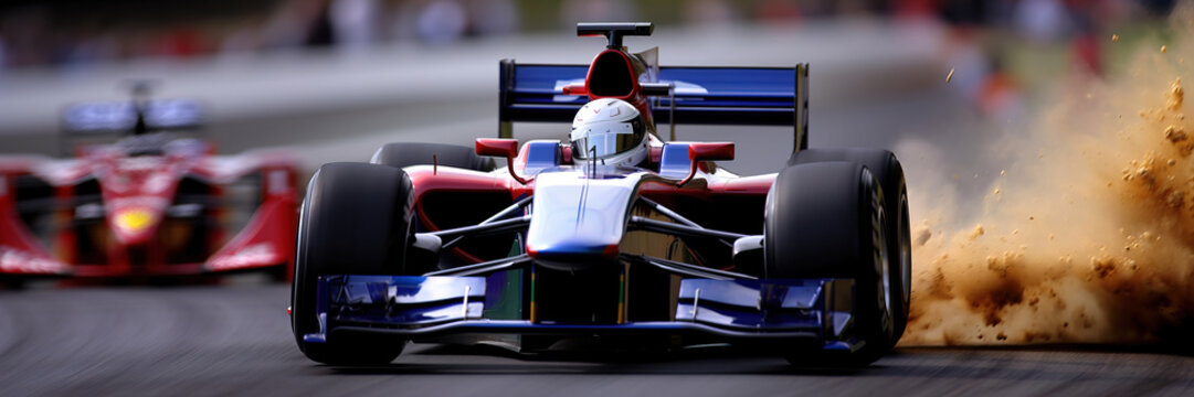 Generative AI illustration of formula 1 car speeds on the racetrack kicking up a dramatic cloud of dust and debris capturing the intensity of the race