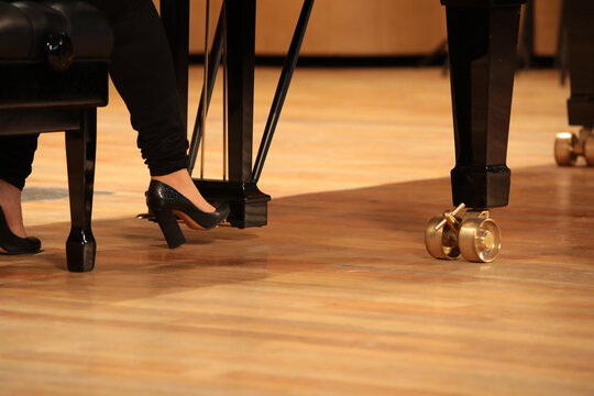 Close-up view of a female leg in a black high-heeled shoe presses on the piano pedal