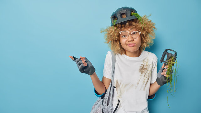 Hesitant confused woman stops on road after falling off bike holds pedal points left on copy space wears protective helmet and white t shirt shows place for your advertisement isolated over blue wall
