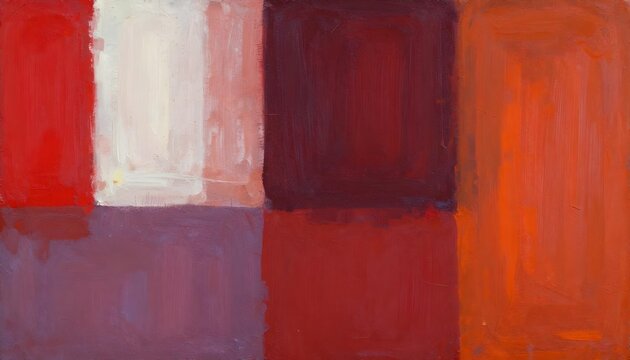 Abstract expressionist painting with bold blocks of red, purple, and cream colors