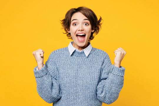 Young overjoyed happy woman wears grey knitted sweater shirt casual clothes doing winner gesture celebrate clench fists say yes isolated on plain yellow background studio portrait. Lifestyle concept.