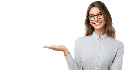 Smiling businesswoman presenting with open hand for copy space