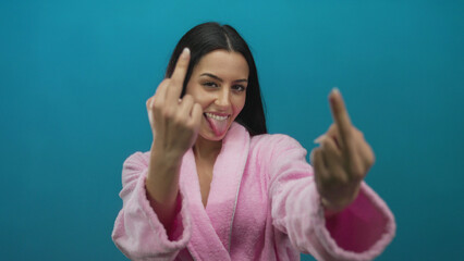 Hispanic woman in pink robe makes a bold gesture displaying middle fingers against a blue wall, conveying a playful and rebellious attitude.