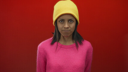 African american woman performs listening gestures against a vibrant isolated green background, highlighting expressive emotions and communication.