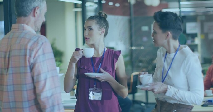Talking woman in sleeveless purple blouse and lanyard holding white cup and saucer in office