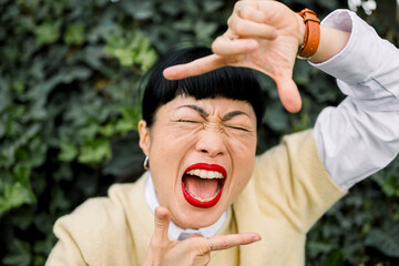 Expressive portrait of smiling woman making playful gesture outdoors