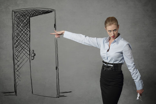 Red man comes out of structure of people. Integrity violation, non-conformist. Dismissal. Dismissal from the company. Expulsion from society. Different from others. Overflow. Exit, leave, renounce.