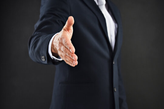 Lets do business. Cropped shot of a businessman extending his arm to shake hands against a black background.