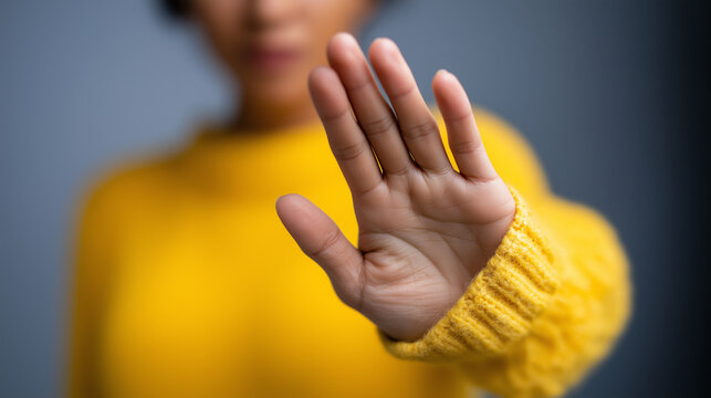 A person in a yellow sweater is extending their hand forward with an open palm in a stop gesture.
