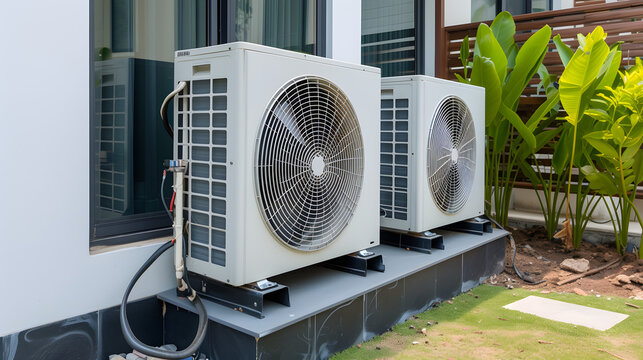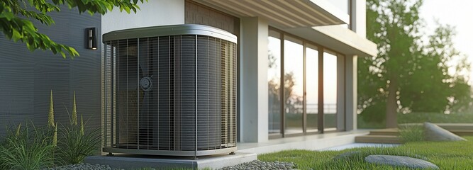 Condenser or compressor unit located outside a home or residential building. Part of a central air conditioning (AC) or heating, ventilation, and air conditioning (HVAC) system. Features an electric f