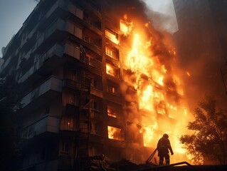 Fireman extinguish fire with the hose. Burning house fire drill. High quality photo
