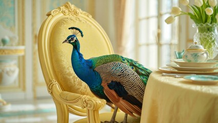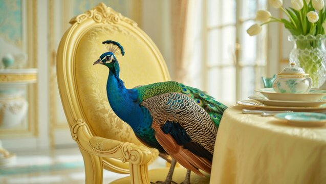 Peacock standing on ornate gilded chair in opulent baroque interior, symbolizing luxury and extravagance