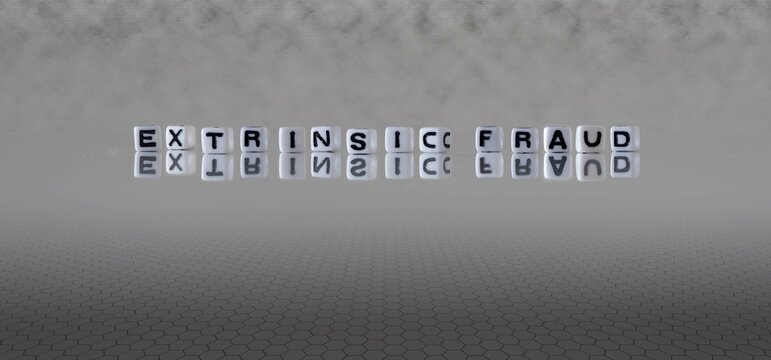 extrinsic fraud word or concept represented by black and white letter cubes on a grey horizon background stretching to infinity
