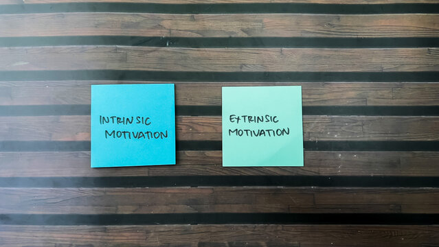 Concept of Intrinsic Motivation and Extrinsic Motivation displayed on sticky notes placed on a Wooden Table.