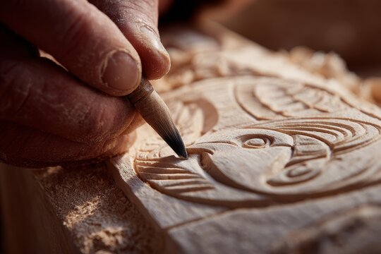 Wood carving of an eye is being meticulously worked on with a chisel by a hand creating a relief design