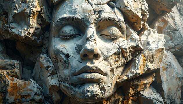 Close-up view of an ancient stone carving depicting a serene human face surrounded by intricate geometric designs