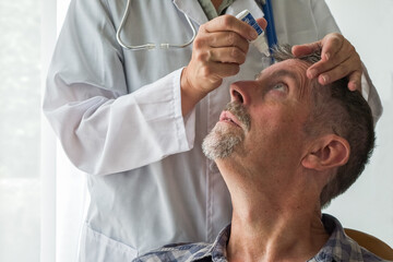 Eye examination a doctor puts eyedrop medication into a man's eye during an appointment at the hospital.