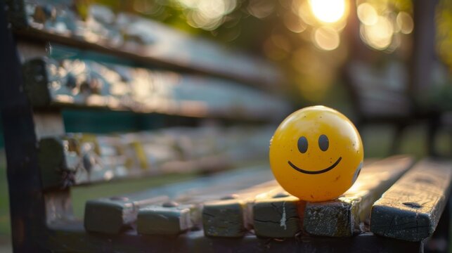 giant yellow ball with a happy face on a park bench on a sunset in high resolution