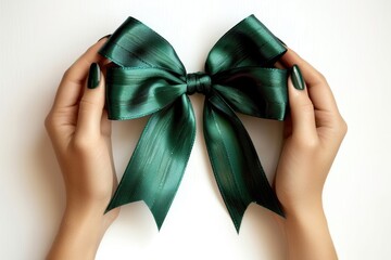 Green ribbon for gallbladder and bile duct cancer awareness month in February, bipolar disorder, mental health illness with kelly green bow isolated on hand support background