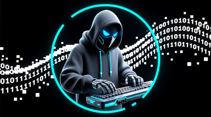 Ai robot wearing a dark hoodie and a face mask that leaves only the eyes shadowed. The hacker's hands are positioned over a computer keyboard, suggesting active typing.