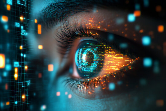 A futuristic, robotic eye in an extreme close-up macro shot, featuring a glowing blue lens and digital interface for advanced vision technology.