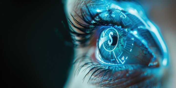 close up of human eye illuminated by vibrant blue light, showcasing intricate details and reflections. image evokes sense of wonder and technological advancement