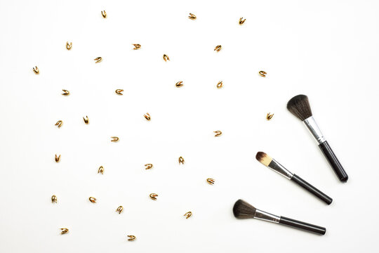Cosmetic make-up brushes and golden trinkets on white background