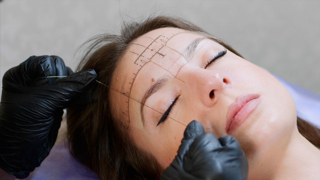 The process of shaping eyebrows by a beauty master with a thread for a young lady in the studio before the microblading. Close up view of a face while the procedure of marking lines.