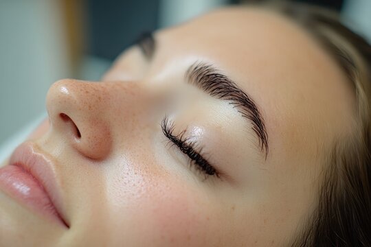 Stunning Lady With Enhanced Lashes And Tinted Brows In Soft Lighting, Captured In Close-Up Shot. A Gorgeous Transformation.