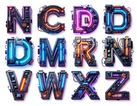 A futuristic, stylized alphabet.  Letters glow with vibrant, neon colors.  Mechanical parts and circuitry are visible within each letter's design.  Image is isolated against white