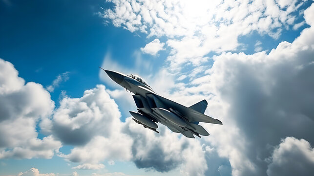 F16 military fighter  flies through the blue sky and clouds.