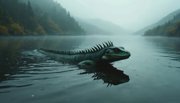Large reptile with red eyes swims in misty lake surrounded by foggy forest hills. Ancient creature emerges from dark aquatic environment. Mysterious legend comes alive in serene landscape.