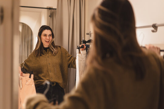 Female fashion designer choosing fabric samples in workshop