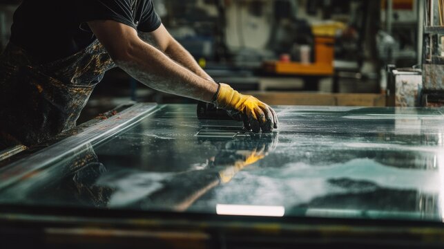 Worker expertly cuts glass sheets on a cutting table with precision diamond-tipped tool in well-lit workshop environment