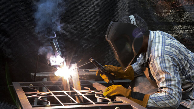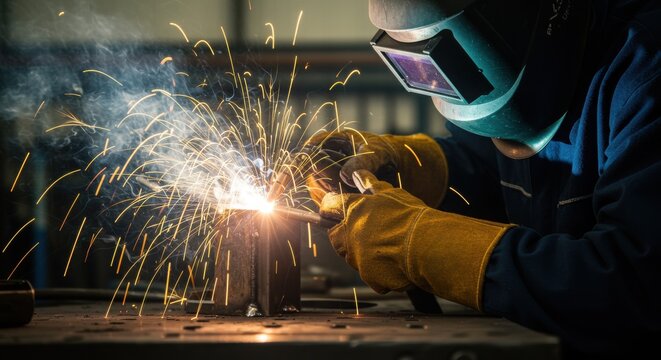 Focused welder in helmet and gloves performing metal join with bright arc and thick smoke on steel structure in workshop environment