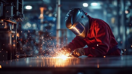 A young  man welder in  uniform, welding mask and welders leathers, weld  metal  with a arc welding machine in workshop, blue and orange  sparks fly to the sides