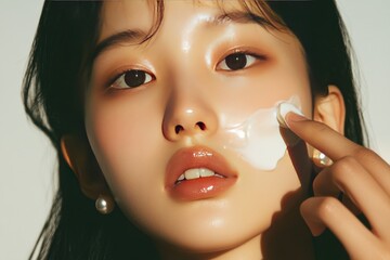 Woman applying skincare cream in dreamy pastel atmosphere