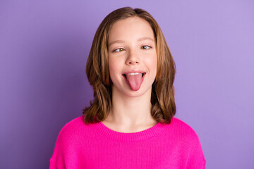 Photo of funny funky young small girl make silly face stick-out tongue isolated on violet color background